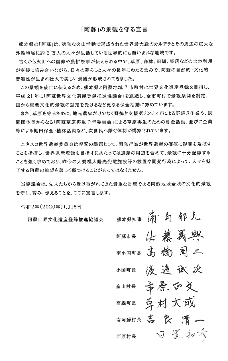 令和2年1月16日、熊本県と阿蘇地域7市町村で構成する阿蘇世界文化遺産登録推進協議会は、「『阿蘇』の景観を守る」宣言を採択しました。